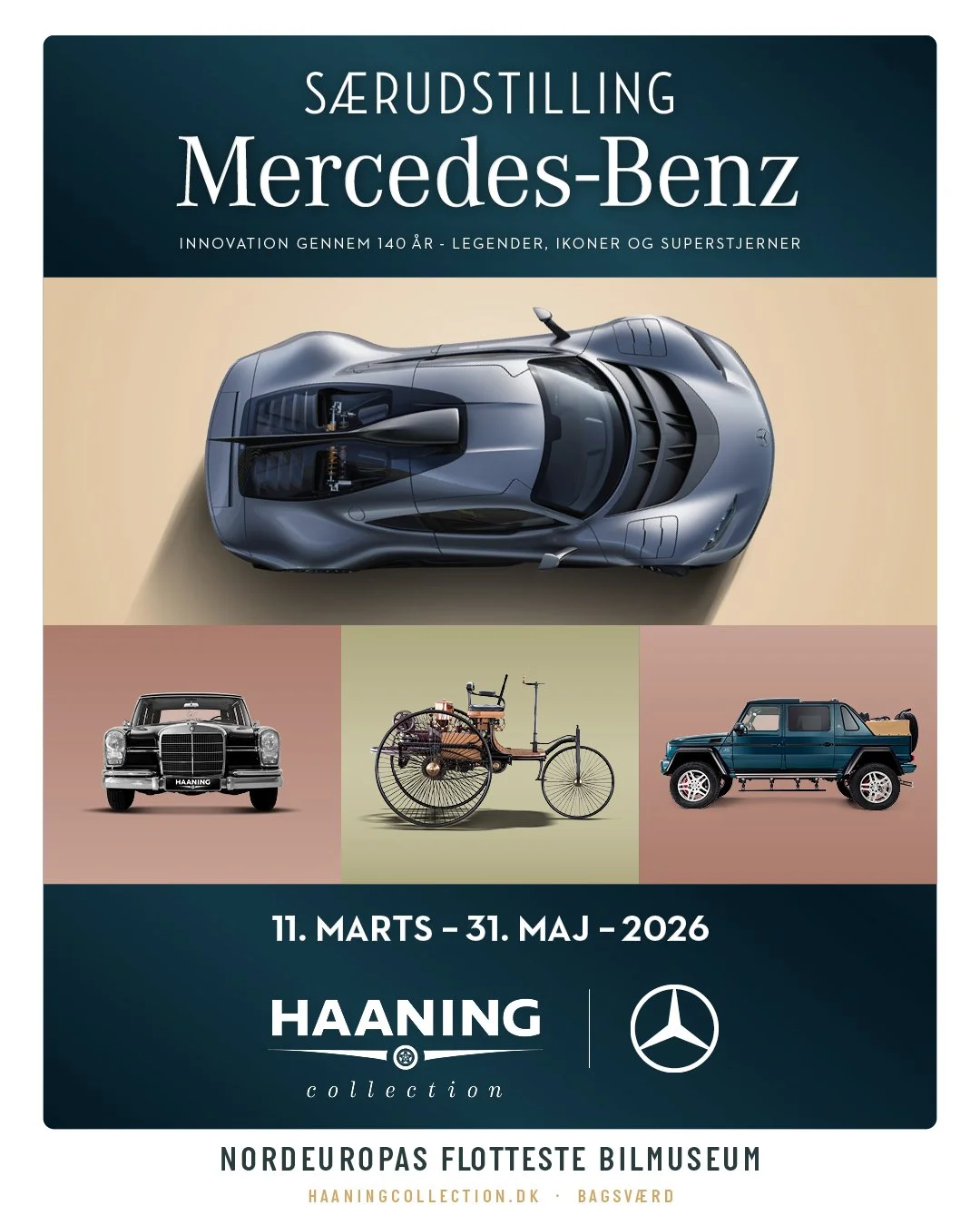 Fra verdens første bil til den mest ekstreme nogensinde: bilmuseet Haaning Collection hylder 140-året for Karl Benz’ revolution med en næsten tre måneder lang særudstilling, som tager besøgende med på en rejse gennem et af de mest berømte bileventyr. De besøgende kan glæde sig til alt fra luksusbiler, sportsvogne, superbiler og racerbiler til helt almindelige, praktiske hverdagsbiler fra det ikoniske bilmærke!